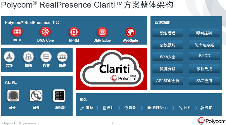 RealPresence Clariti 包括橋接、視頻通話控制、Web 協(xié)作、軟件終端、設(shè)備管理和防火墻穿越所需所有軟件組件的授權(quán)。它根據(jù)并發(fā)用戶量和附加選項(xiàng)(如硬件啟用、高級(jí)分析、視頻內(nèi)容管理和其他確保企業(yè)成功的優(yōu)質(zhì)專業(yè)服務(wù))進(jìn)行定價(jià)和許可。我們的實(shí)施服務(wù)可讓您根據(jù)自身需要,靈活選擇要進(jìn)行部署的內(nèi)容、位置和數(shù)量。